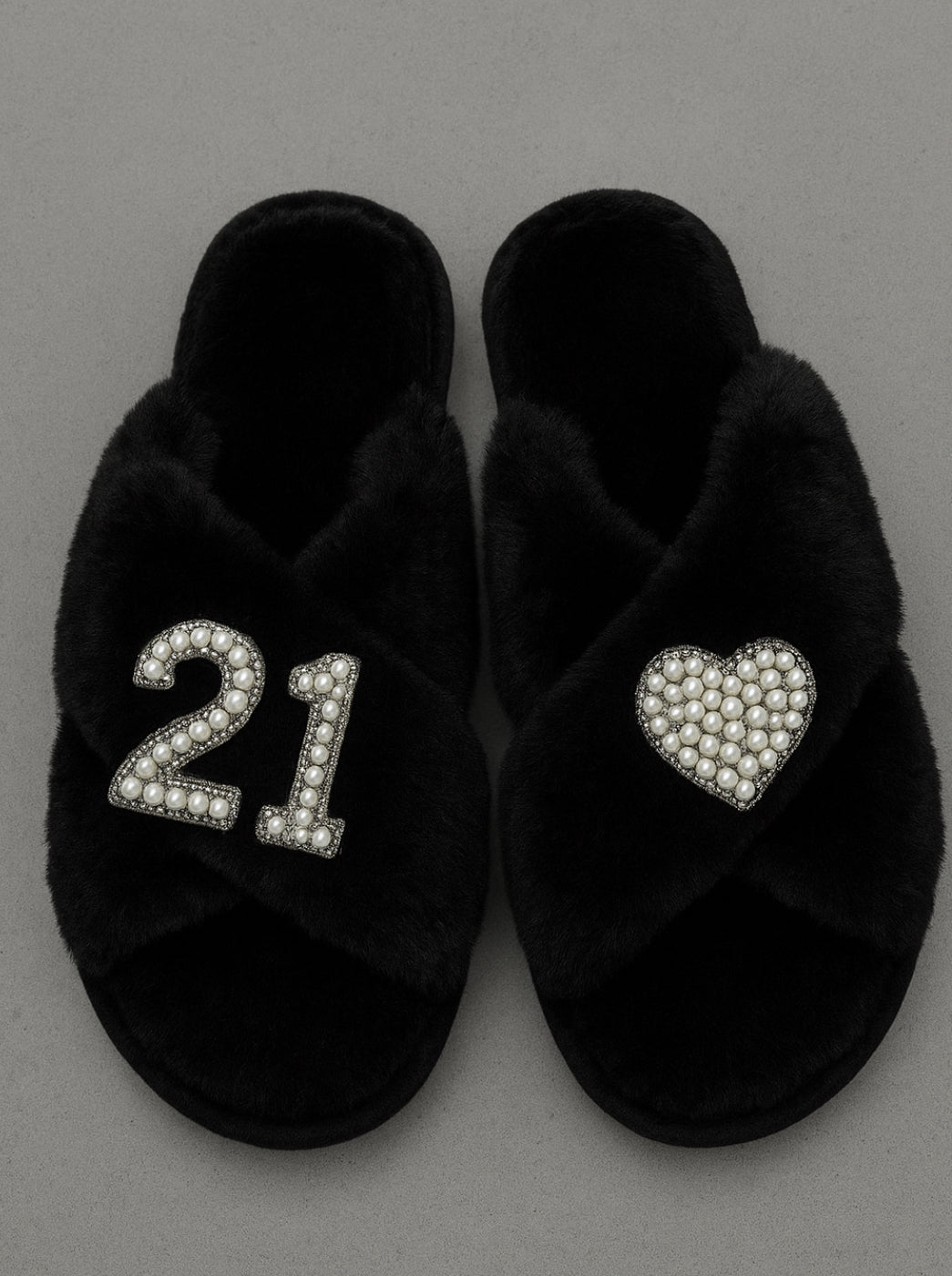Crafted with ultra-soft faux fur, these black open-toe slippers feature glamorous pearl-embellished designs that make your special day unforgettable. Each pair is customizable with your age, making them the ultimate birthday slippers.