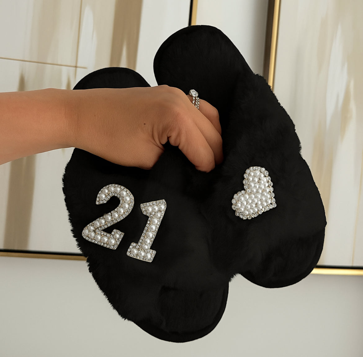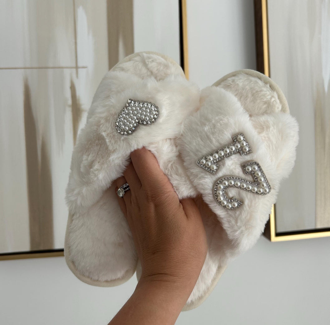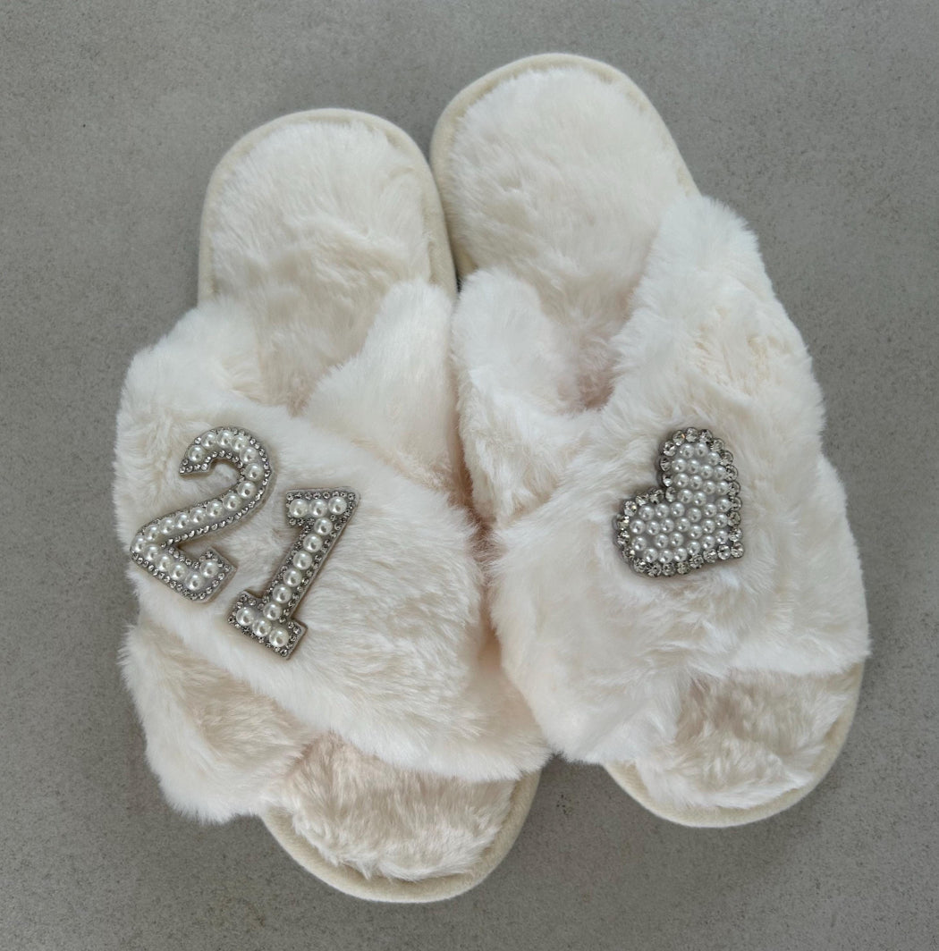 birthday personalised slippers, 21st birthday slippers, 30th birthday slippers, 40th birthday gift, 50th birthday gift, custom birthday gift, milestone birthday slippers, pearl embellished slippers, luxury cozy slippers, birthday gift for her