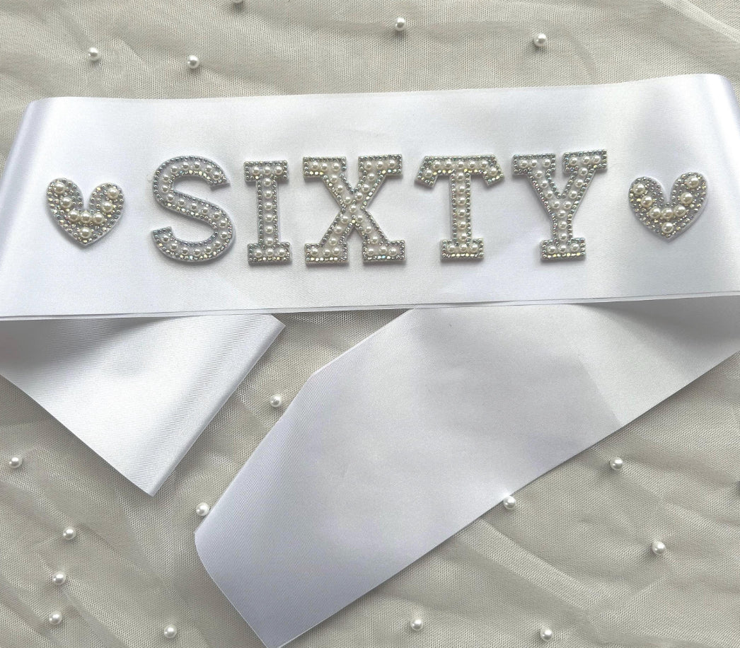 Our luxe Pearl birthday sashes, elevate your birthday look with our personalised birthday sashes